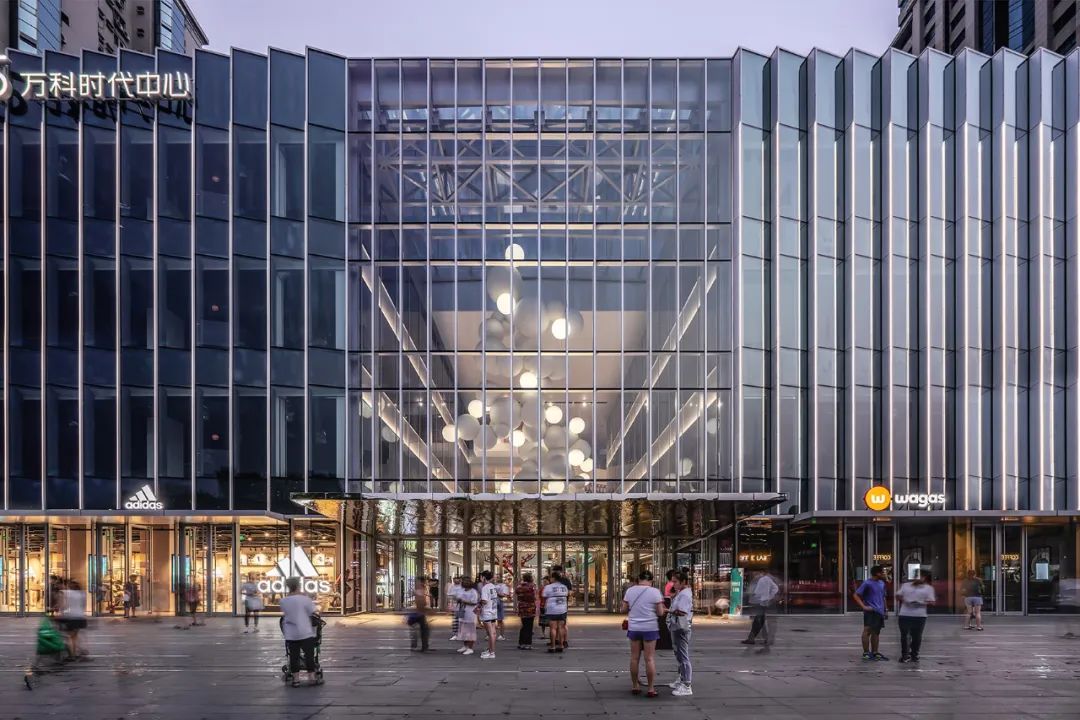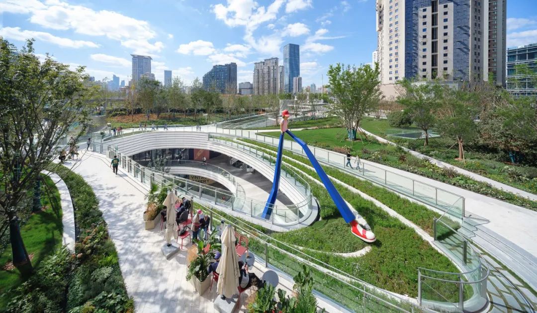 上海苏河湾万象天地位于上海苏州河畔,它的落成打破了这座城市过去、现在与未来的界限。香港创意工作室AllRightsReserved携手德国艺术家IngesIdee创作了两件雕塑作品,进一步洞穿了商业与绿地的峡谷空间:“大象亲子乐团”是两只一大一小的卡通象雕塑相互对望,将地上绿地与地下商业连接起来,以喇叭与低音号为创作元素,其流线形态与洞口的弧度相呼应。另外一件雕塑作品“迈上!”则模仿一个孩子迈着轻快的步伐穿过绿地走向街头,主人公的长腿跨过两层商业峡谷,直到地面上的梯田式地景。艺术作品的创意突出了地面绿地和地下商业空间的穿透性。