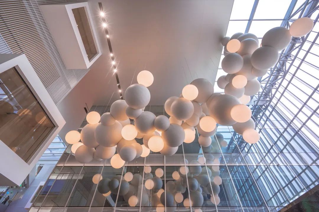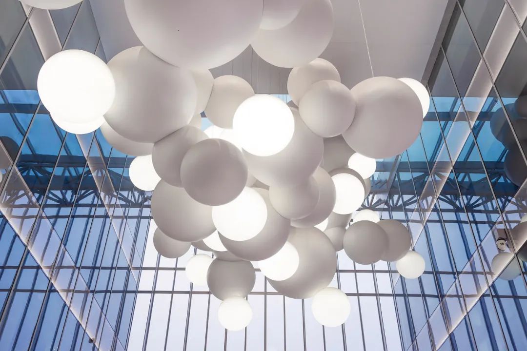 Charles Pétillon是一位法国摄影师和装置艺术家,以他描绘了大量白色气球的作品而闻名。这些临时的艺术装置看起来像是巨大的、脆弱的云朵,改变了人们看待空间的方式。由近100个手工打造的不同大小的铝球组成,装置直接参考了艺术家Pétillon的早期作品,悬挂在入口中庭,无论在商场外部还是内部看都是一个引人注目的作品。一些球体从内部发光,为参观者们对空间的体验增添了独特的视觉感受。UAP与艺术家合作来对作品进行深化设计、制作和安装,并选择最合适的材料和照明来模拟气球的失重状态。最终作品为空间提供了有力的艺术设计,将艺术和设计元素和谐地融入了中庭。
