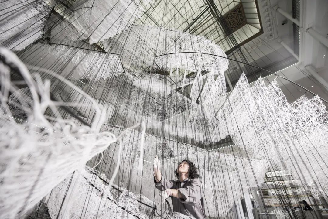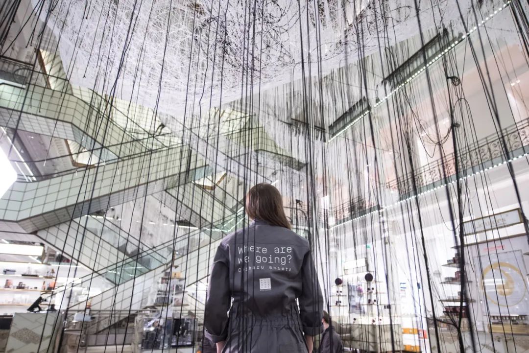“盐田千春是一个充满力量的艺术家,为我们展现了一个充满希望与人文主义关怀的现在与未来。而正如我们所举办的其他展览一样,本次的展览在乐蓬马歇百货公司中创造了一段奇幻旅程。设计师希望让客人能够这独特的空间体验中认识、了解艺术家与其作品,并带着愉悦离开。”乐蓬马歇百货公司的CEO – Patrice Wagner说。来自世界各地,不同文化背景、不同形状尺寸的“小船”悬挂在建筑中庭的玻璃屋顶之下。深黑色的金属划出微微起伏的边框,仿佛笨拙的钢笔线条。而在建筑的一层,她打造了一个人们可以穿行通过的巨大“海浪”,这个由白色纱线编织而成的壮观网状装置被命名为“海洋记忆”。这个名为“我们将去往何方?”的展览在商业空间中创造了一个独特的空间体验。充满了希望与生命力的展览标题仿佛在邀请来往的人们一同踏上小船,开始一段奇幻而未知的旅程,让顾客在视觉刺激之余更有深层的思考。
