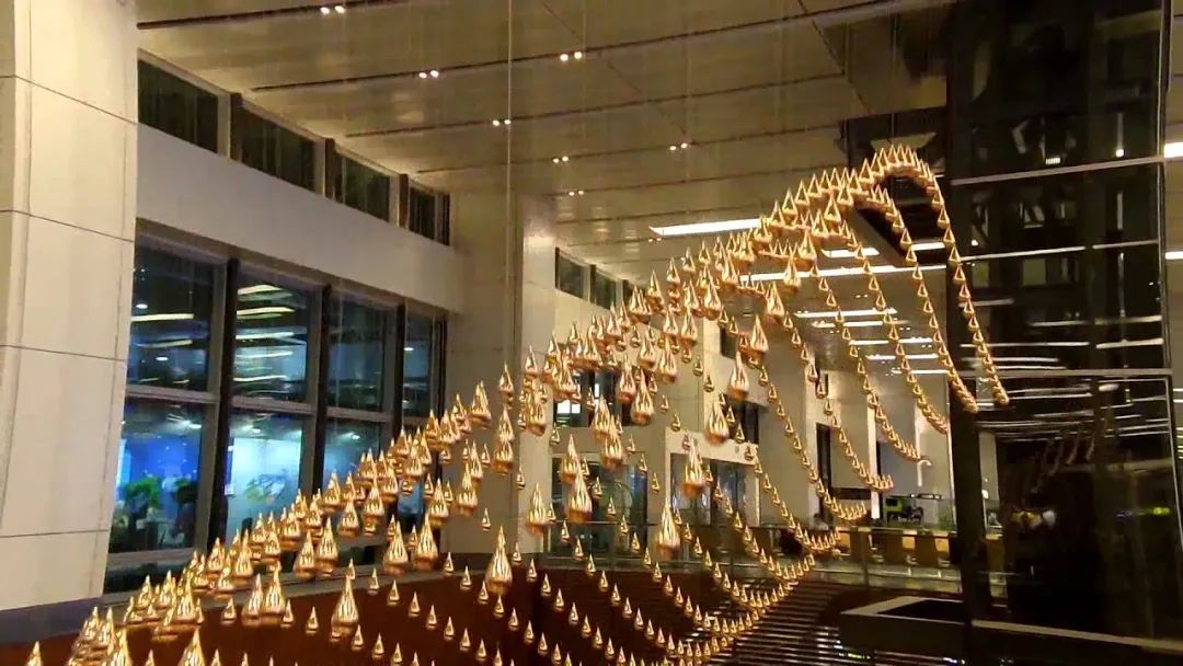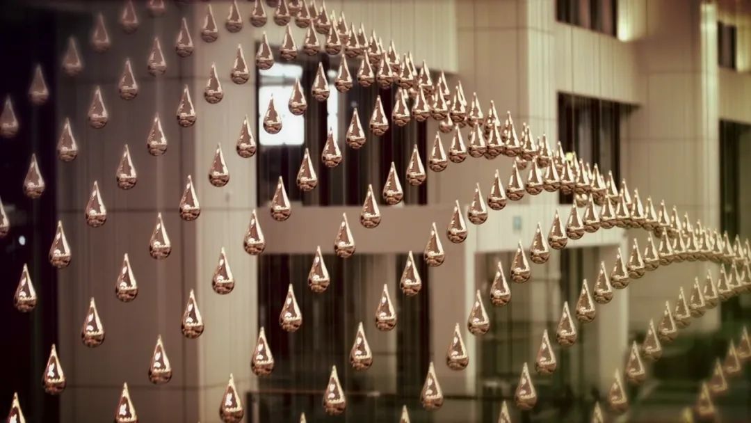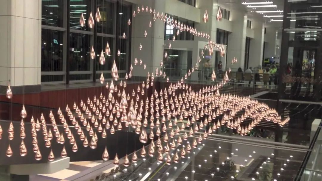 由 ART+COM 打造的《Kinetic Rain》位于新加坡樟宜机场,上千颗颗金色水滴轻盈地悬吊在半空中,由计算机控制,会随着背景音乐舞动出一片壮观精致的金色波浪,让繁忙的国际机场多了点值得停下来驻足欣赏的美景。金色水滴每颗空心的水滴重180克由材质轻盈的铝制成,外部镀上一层铜可防氧化或被锈蚀,用不锈钢细线吊挂在半空中,连接到天花板处隐藏着一排排沟槽,内部有驱动装置,可以控制水滴们的动向。从单一颗水珠来看,其实就是很简单的上下移动,但是上千颗水珠交互作用就会变得相当壮观,就像机场内下了场金色的细雨,光滑的表面反射出温暖华丽的光泽,像珠宝一样既浪漫又美丽。从抽象的造型到栩栩如生的飞机、热气球、风筝、龙的姿态,令人赞赏不已。每一种舞姿,都以缓慢的液体流动形式,展现飞翔的美姿。从最上方到最底部,水滴流过7.3米的距离。超过千滴“雨水”和谐地一起协作,雨之舞象征机场这个社群的成员们一起合作,给乘客与访客带来一个令他们惊艳万分的体验。