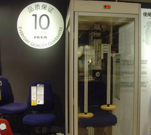 此外,宜家很多商品可以让消费者拿回家试用,也有很多商品让消费者可以现场试用或测试。如,为证明座椅的质量可靠,两个压力锤在机械的操作下反复向座椅施压,并有电子记录屏在不断刷新数字。