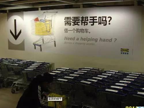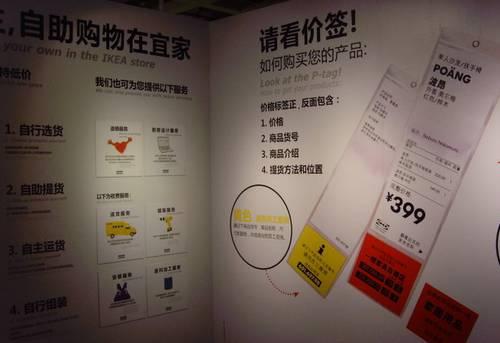 走到每一个区域,你都会发现里面的工作人员不但不会对顾客进行产品推销,还鼓励大家自助购物。在宜家的很多地方,顾客也可看到自助购物的指示牌。这是宜家为节省空间、降低成本,大力倡导“自助购物”。