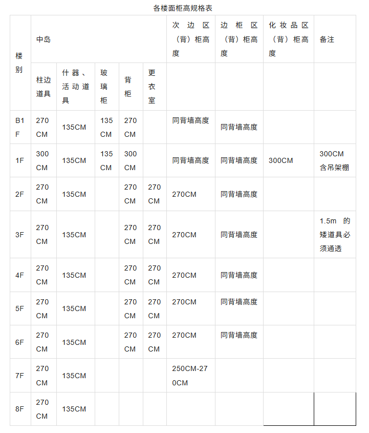 2)中岛道具及玻璃柜有限高要求。(依柜高规格表)