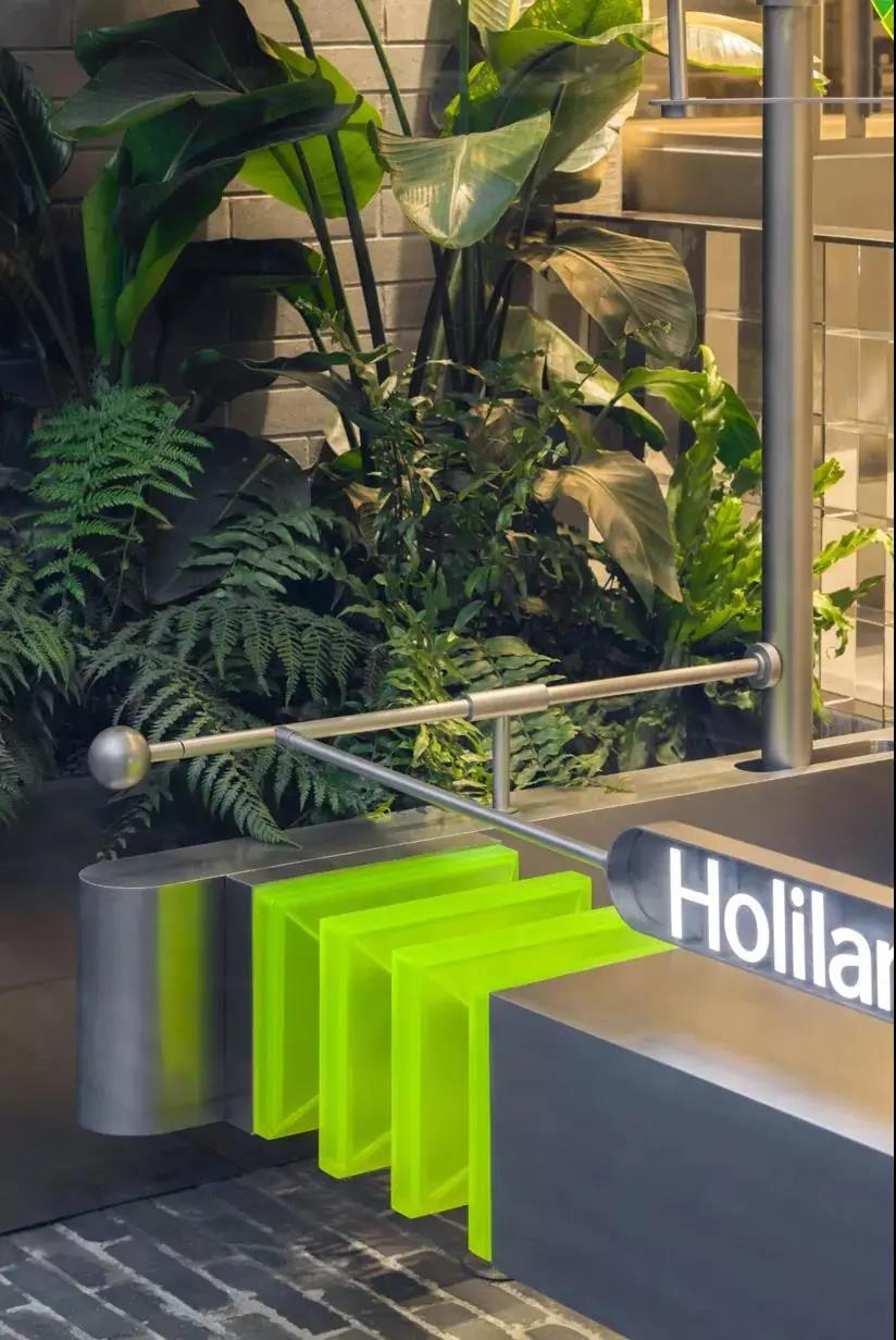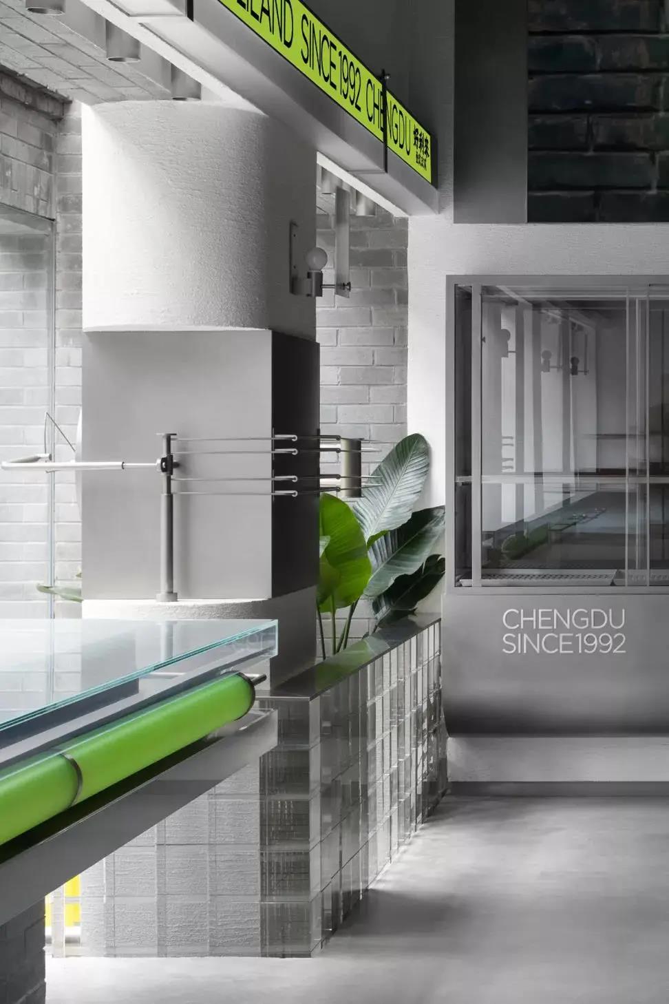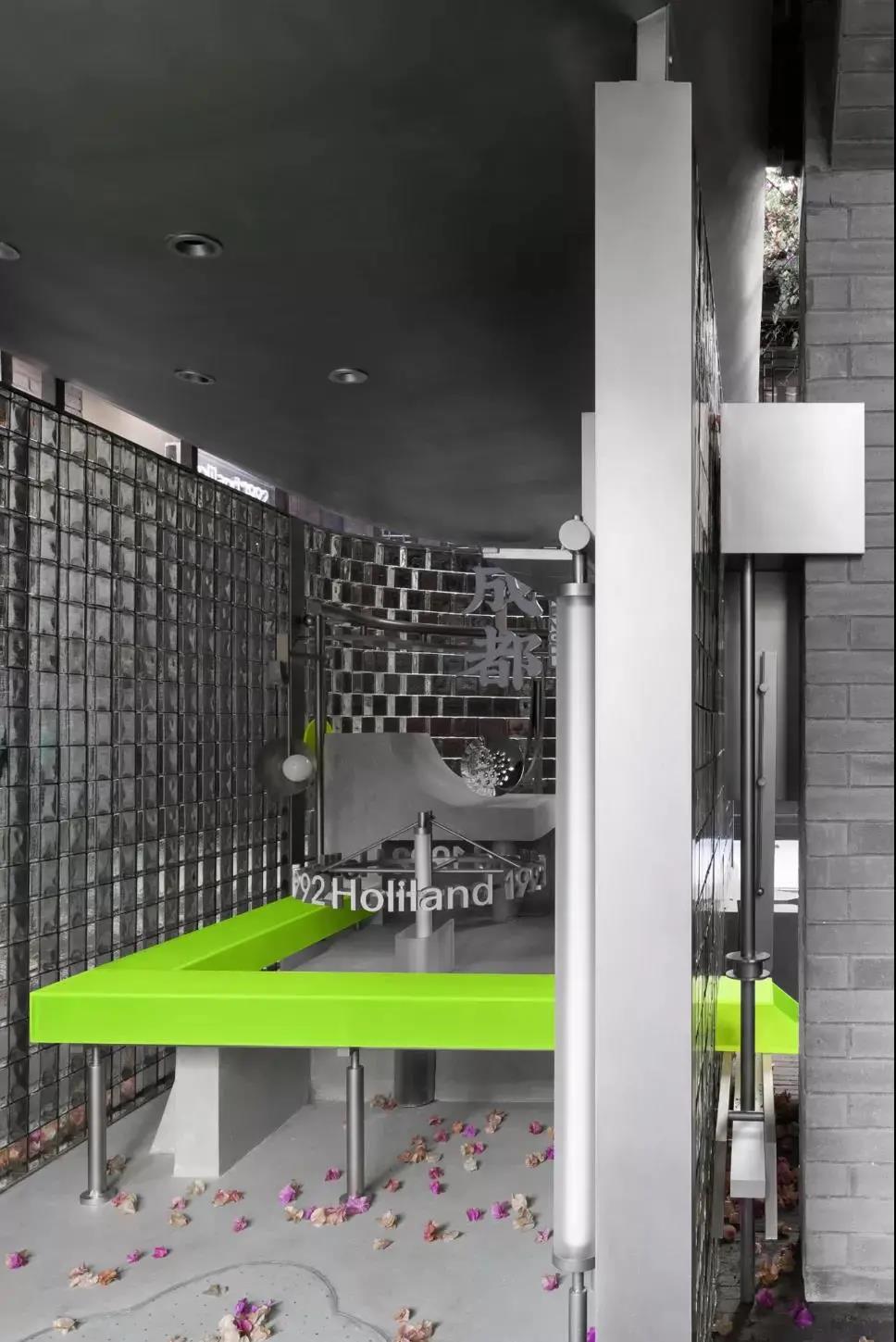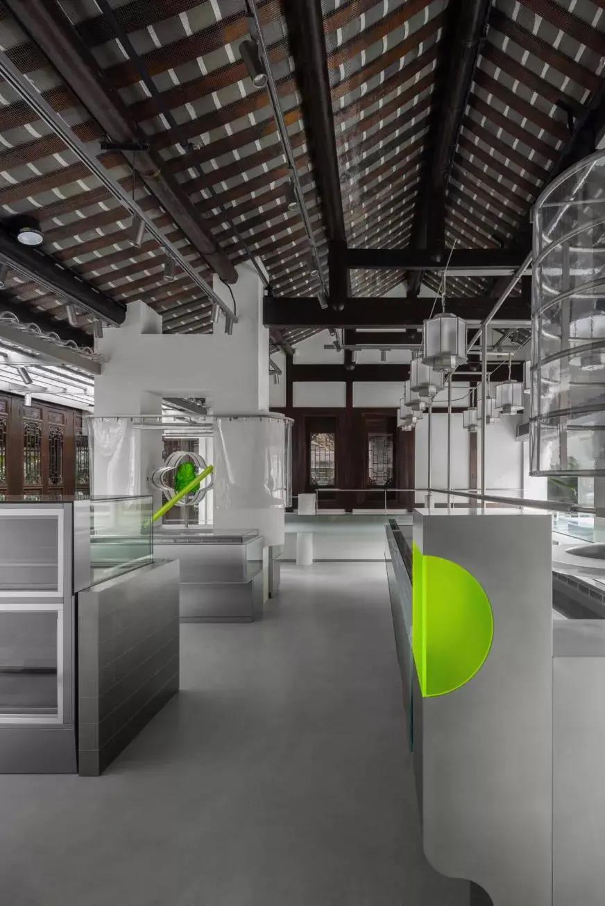 第一,两种不同的元素做硬组合,很容易带来惊喜。旧建筑里的未来实验室,传统木门配炫酷金属,朴实青砖配荧光绿亚克力。