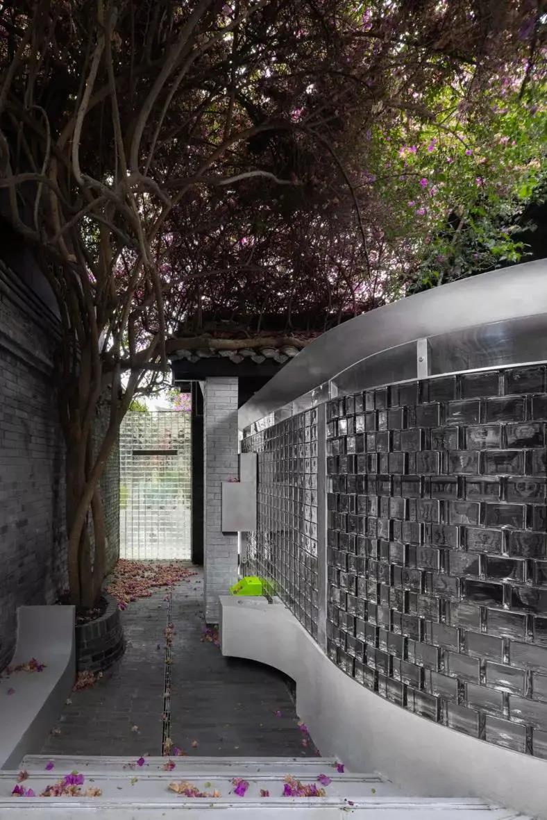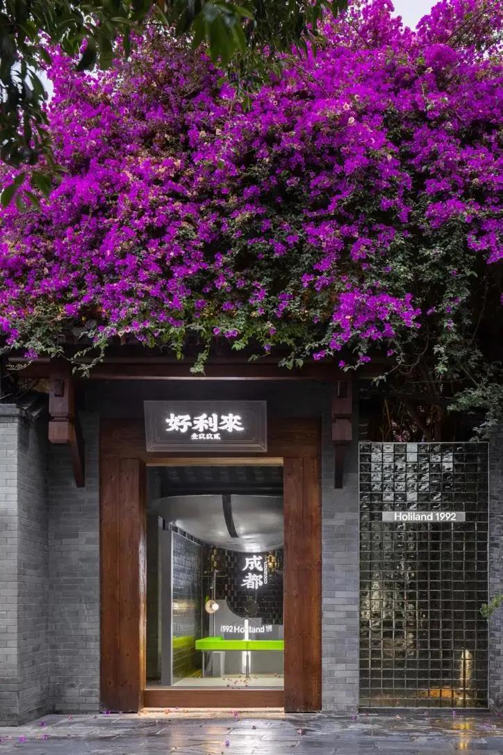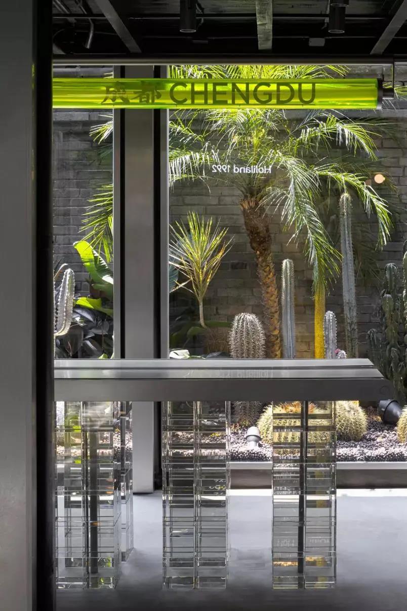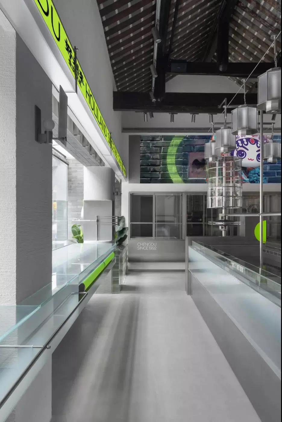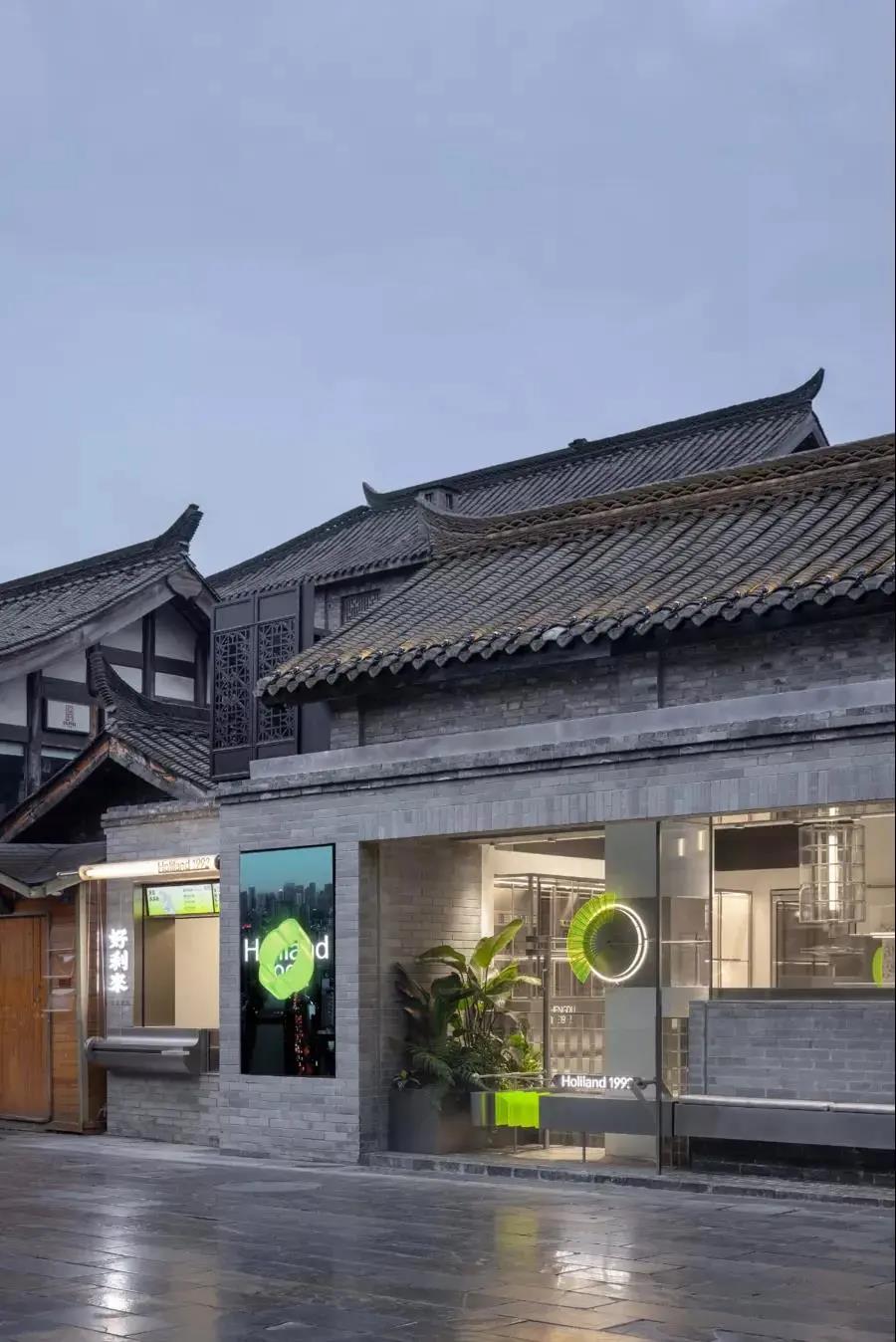 第一,两种不同的元素做硬组合,很容易带来惊喜。旧建筑里的未来实验室,传统木门配炫酷金属,朴实青砖配荧光绿亚克力。
