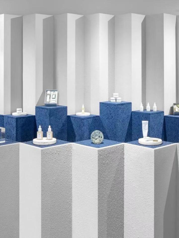 以这个流水台为例,其主要是产品主推连带陈列,简单干净蓝白调跟产品形成了呼应,就可以很直观地看到主推产品。