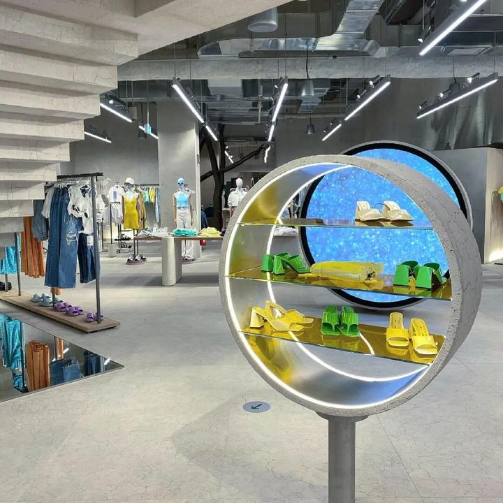 流水台又叫展示台、中岛台,一般是指进店入口中所处的一个视觉区域;通常设置在店铺入口处或者是店铺死角的位置,一般设置为高低台,主要功能是兼顾橱窗的功能,延续产品的视觉体验,起到分流人群和提升消费者连带购买的作用。