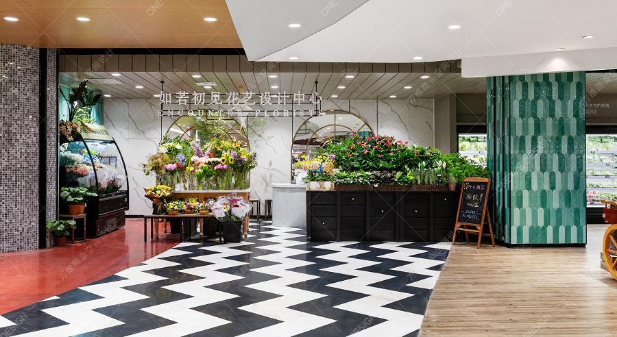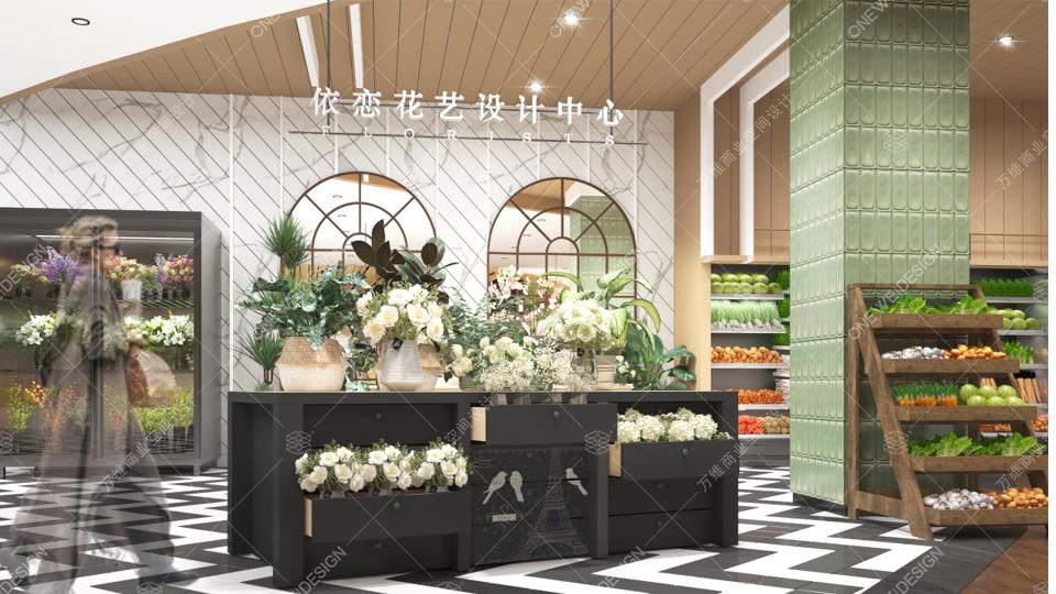 鲜花区延续了果蔬区整体的主题视觉概念,配合镂空的拱形门设计,无阻隔的视觉动线增加了空间的通透性。