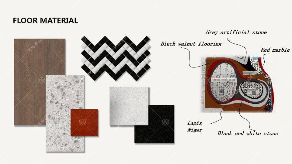 在整个风格统一的卖场中,采用了不同色调不同材质的地面铺贴材料,可以让顾客在不同的区域得到不同的购物体验。