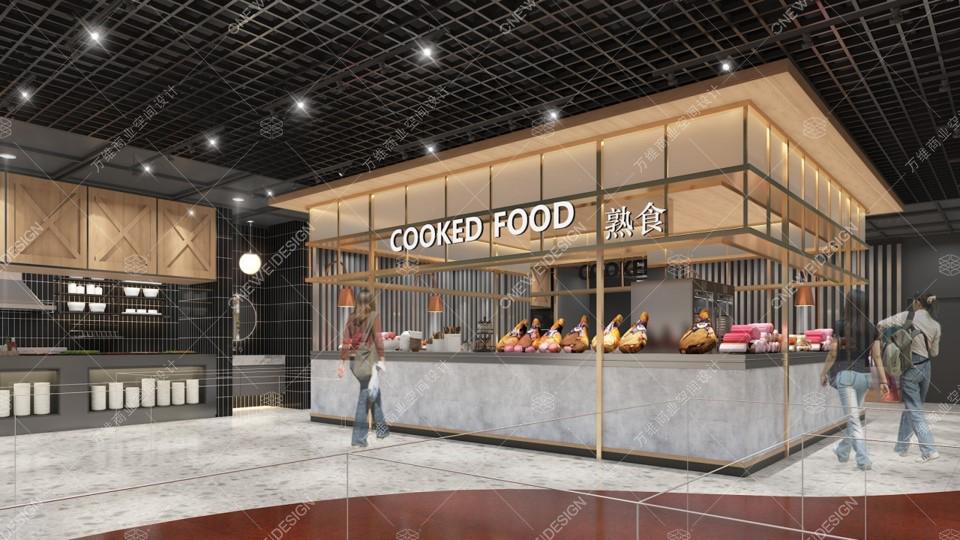 熟食档口区以原生木色搭配水泥灰,粗犷中带有温润感,除去纷繁复杂,返璞归真,大胆地暴露原始结构和肌理,将实用性和创造性融入空间。