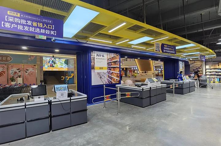 超会买门头设计效果图空间设计以简约的黑白灰为基调,从空间动线上去展示品牌的视觉识别系统。通过门头、海报、广告牌等视觉输出,向用户传达品牌关键信息。用丰富齐全的指引标识,强化品牌符号认知,形成品牌整体印象感知。