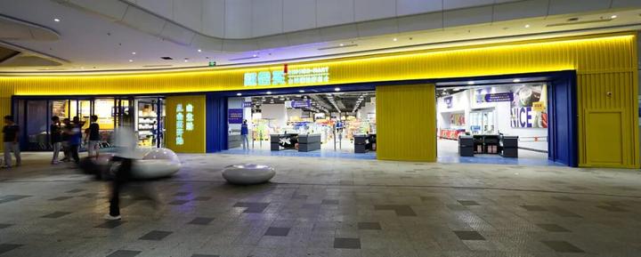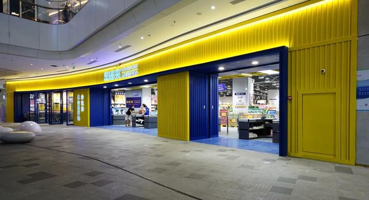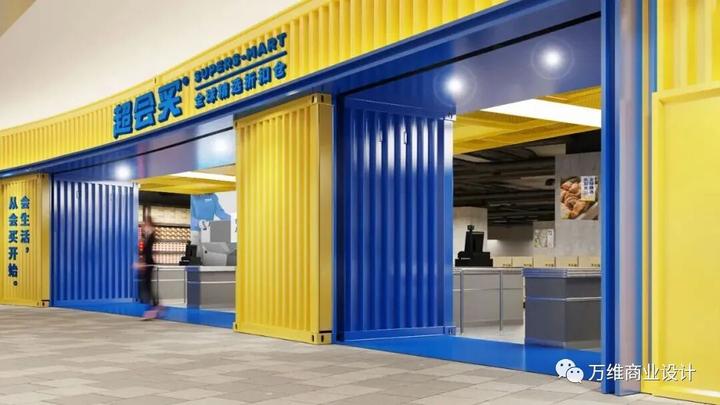 门头和招牌,对门店引流至关重要。在超市入口的设计上,我们将横向宽幅最大化,招牌选用葵黄色与海蓝色的撞色搭配,葵黄色开朗明亮,海蓝色平静放松,体现温馨时尚与新鲜感,提升整个空间的氛围,结合集装箱的形态,自然锁定消费者的目光。