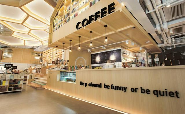 看书累了,来咖啡吧坐坐吧。咖啡吧丰富了书屋的业态,为书屋增添了创新色彩。吧台顶部有一个悬空的书屋,很好地连接了一、二层空间,通过文化的互动与独特的视觉设计让读者从情感上认同品牌的理念。