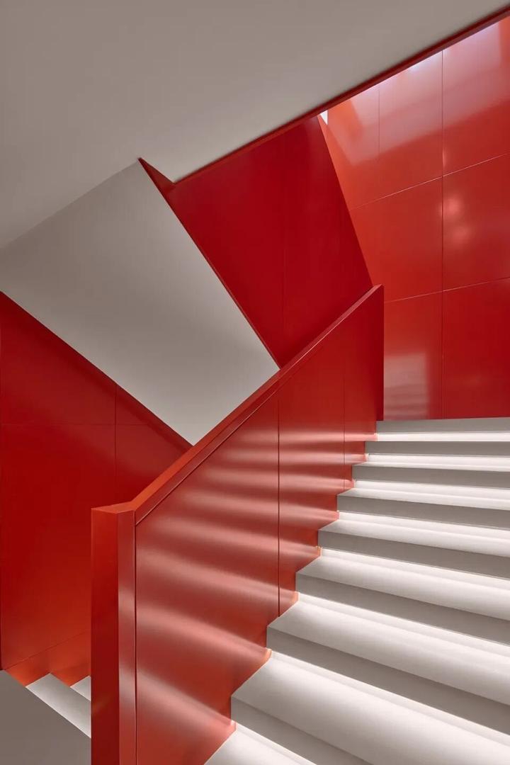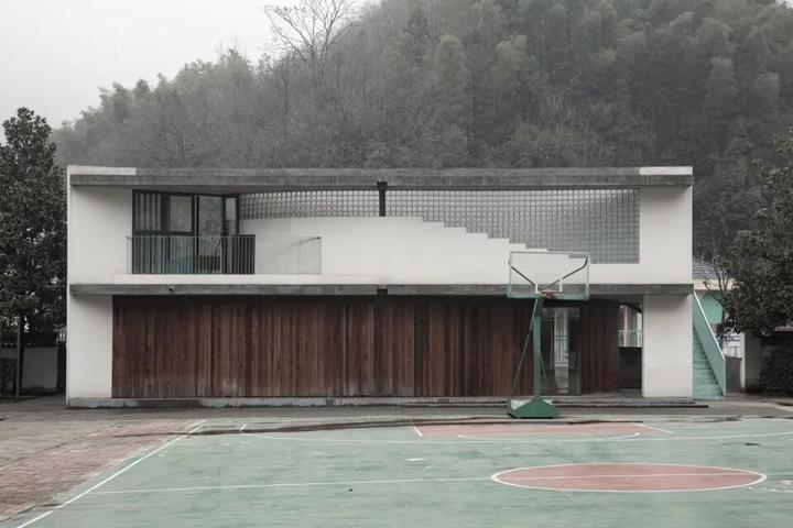 二层一个直角三角形的室外阶梯露台,开口朝向学校背后西北方向的山坡。这两个基本形态在平面上被限定在同一个以半圆直径及半径(长宽比1:2)形成的矩形框架内,三角的最长边等于半圆的直径。半圆,三角形,矩形同时在各个楼层相互交织渗透,形成一种模糊的状态。