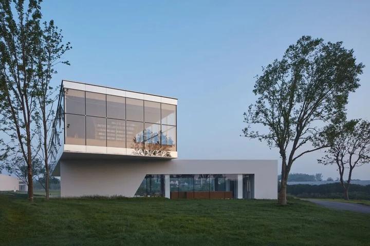 图书馆由一个坚实如雕塑的基座和一个漂浮的玻璃盒子组成,两层体块沿着田野纵向错落叠加,并透过刻意旋转角度使建筑向草原敞开,借此捕捉广袤的田野和清澈的天空。
