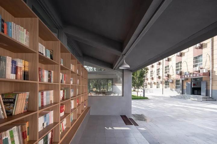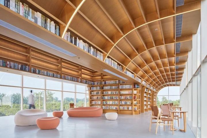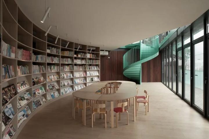 建筑朝向较为安静的泄洪沟一侧大面的落地玻璃,一层半圆形阅读空间所具备的包裹感,使读者自然而然由操场进入图书馆后完成由动至静的心理转换。