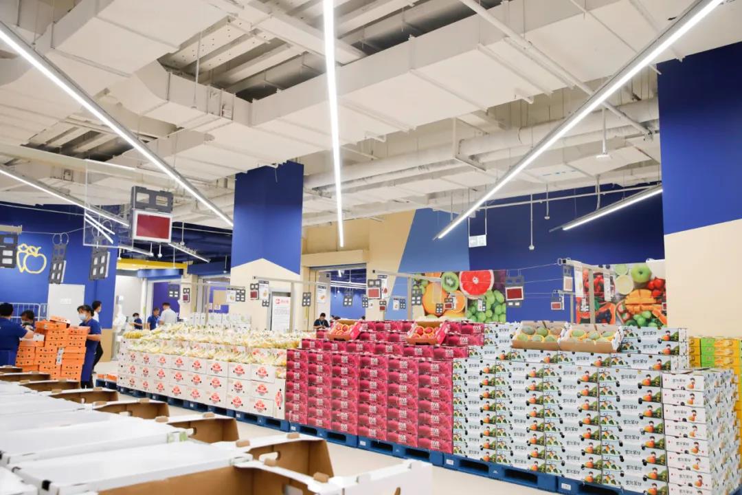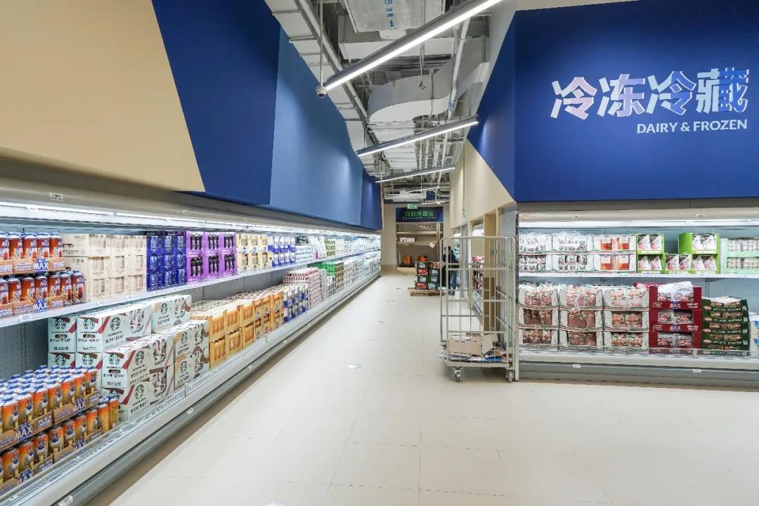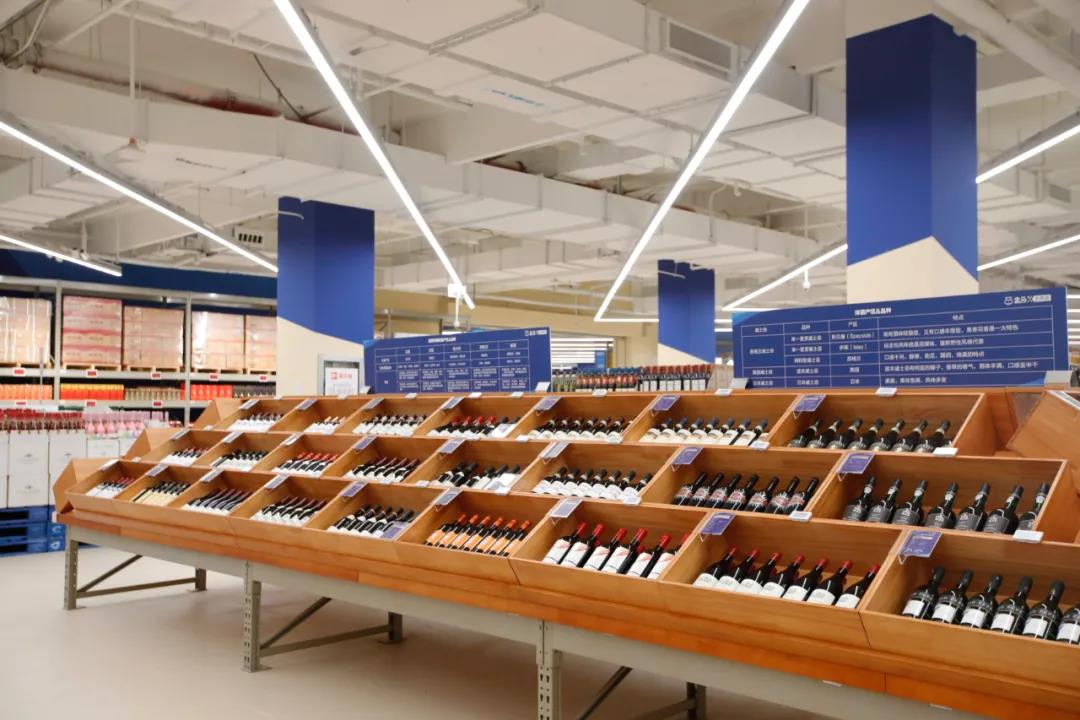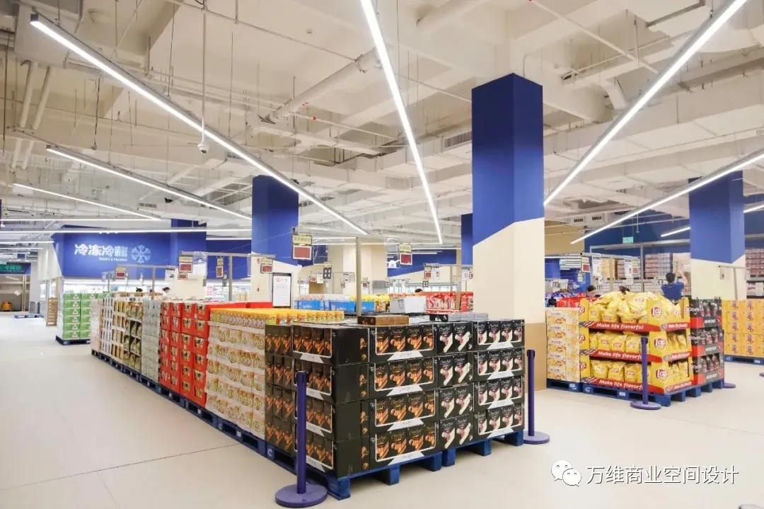 仓储会员超市内部设计科技感十足,蓝白相间的立柱配合天花顶部的条状灯,彰显其品牌特色,灯光在照明的同时,起到了装饰和导流的作用。