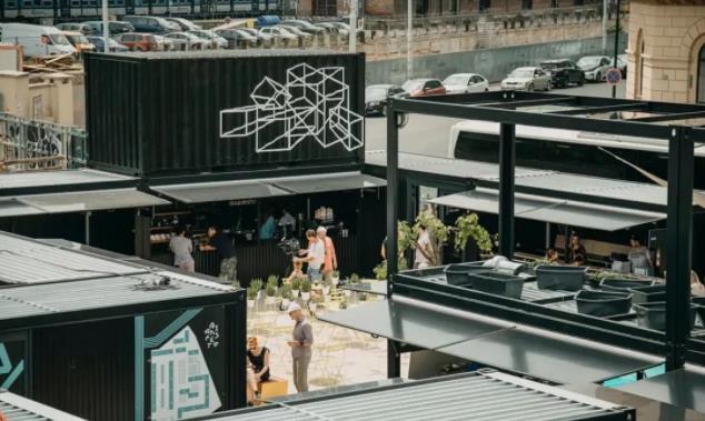 市场的摊位由27个定制的集装箱组成,围绕着街区摆放。集装箱有多重不同的形制以满足每个租户的需求。服务窗和酒吧窗采用模块化尺寸,而黑色外观使项目统一并提供了独立的外观。