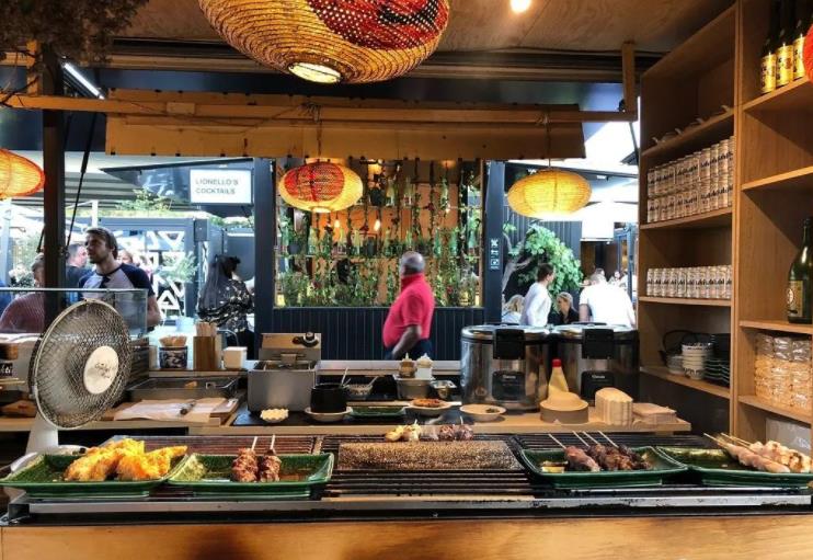 小酒馆桌子、可移动座椅、定制设计的站立式木桌和粉末涂层的钢凳等营造了喧嚣的氛围,六张2米长的公用桌铺设在中间街位,为来客的吃货之旅提供充足空间。