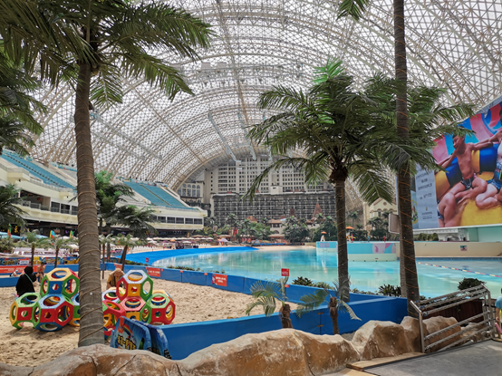 这座长500米、宽400米、最高点122米的建筑,里面包含了40万平方米购物中心,80万平方米写字楼;1000间客房的洲际酒店;25万平方米的海洋乐园—400多米的海岸线、5000多平方米的人造沙滩。