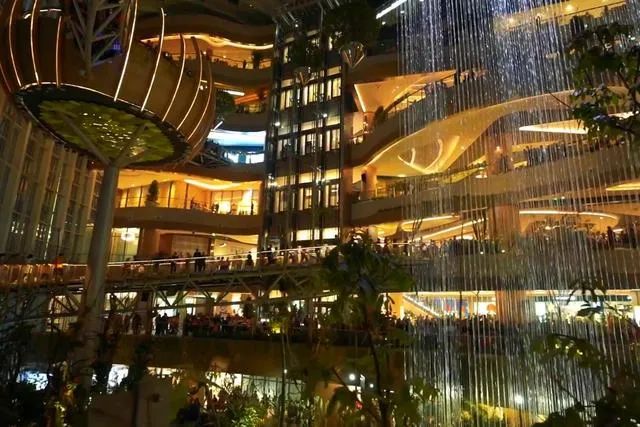 重庆光环购物公园是由香港置地集团打造的国内首个“城市自然共同体”商业,其中“沐光森林”构建跨7层、拥有高42米的立体垂直景观,引入近300种热带雨林植物,包含生命树、悬浮森林、花之瀑谷3大主题场景的12处互动打卡景点。