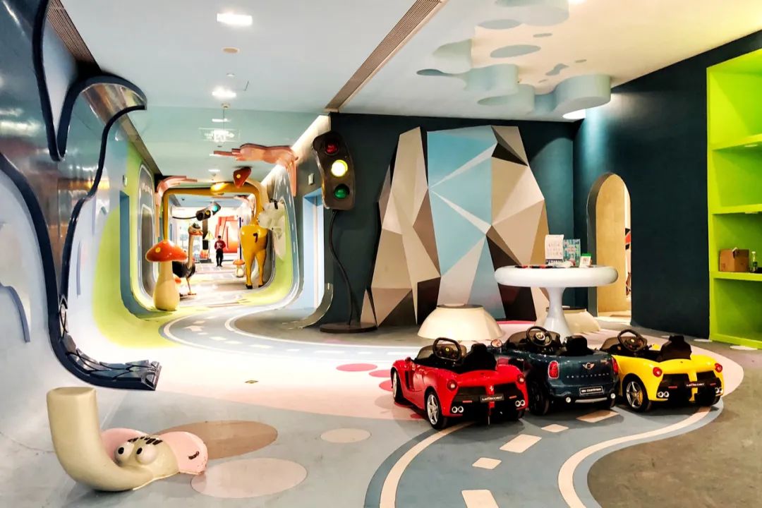 虹桥南丰城是上海亲子家庭型代表商场,在经过常年的IP活动运营后,已经树立了自身特有的定位,而商场在北区2层公共区域设计的这则“儿童车道”主题场景,是对商场客群氛围的“回应”,同时增加了互动业态,丰富了公区空间的视觉。