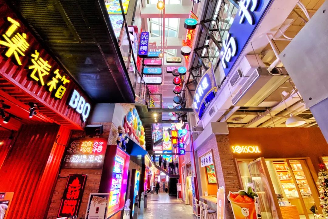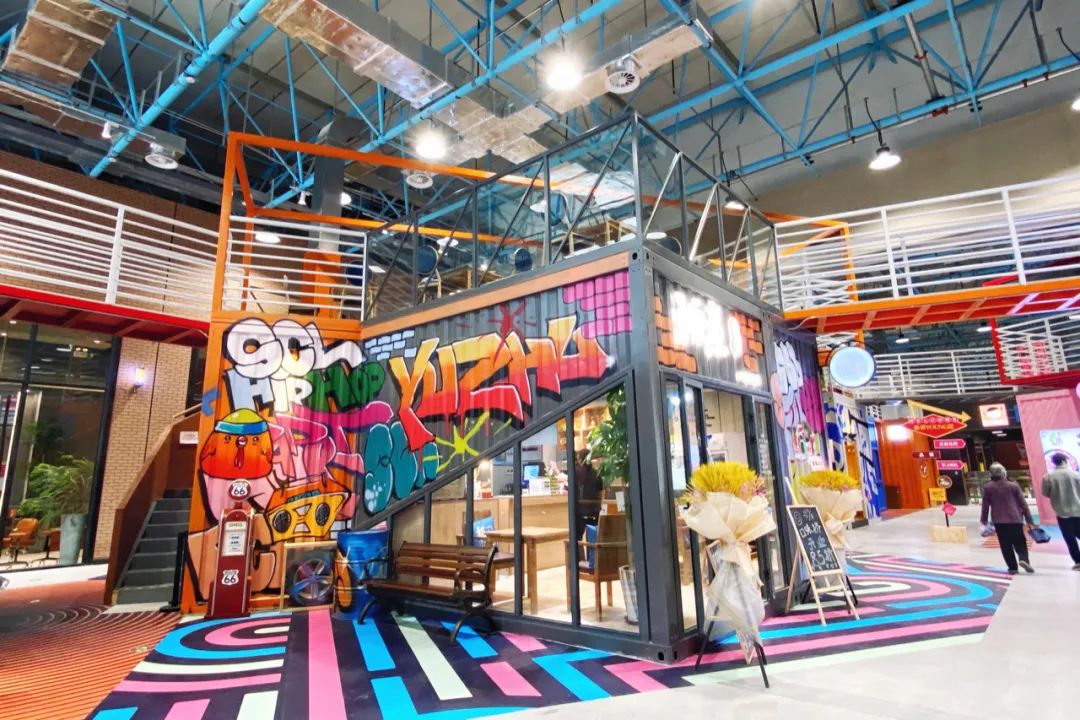 改造后重新开业的百联曲阳购物中心,在其层高较高且具有仓储风格的顶层打造了双层集装箱主题场景街区作为解决方案。
