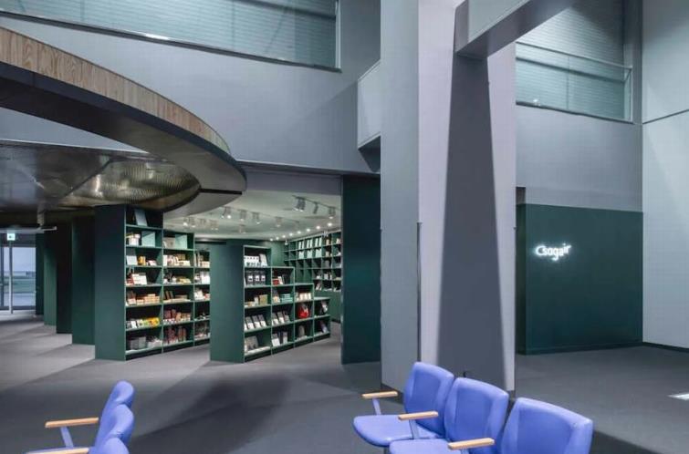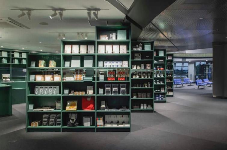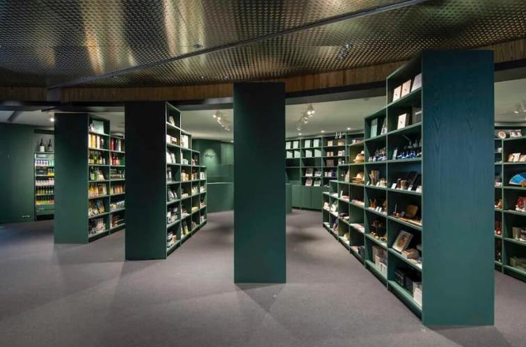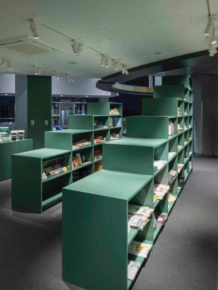 作为店铺的门面,在展示压倒性的商品量的同时,随着往里走,也能感受到开放感。同时,通过在空间内侧营造开放感,尽可能避免从内侧产生死角。在里面,有一个与收银台整合在一起的清酒等品酒空间。