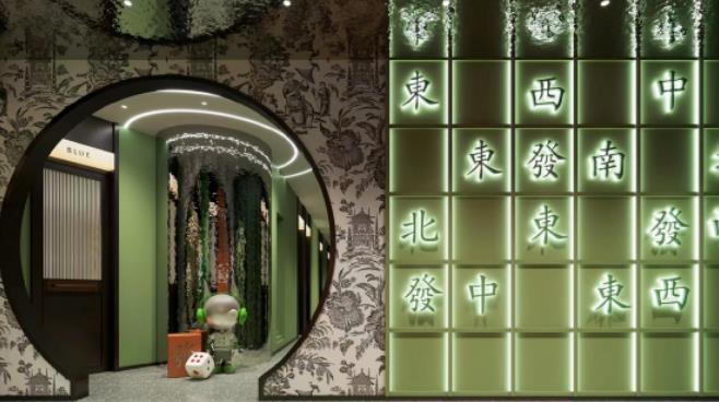 红、黄、绿,这些经典的中国色在国潮风的店铺中常常被大面积的使用,同时也会出现红黄、红绿这些经典的CP撞色。此外,空间中也会看到诸如诗句霓虹字、麻将灯箱等新旧融合的元素,通过这样的混搭在潮流中凸显自己的文化态度。