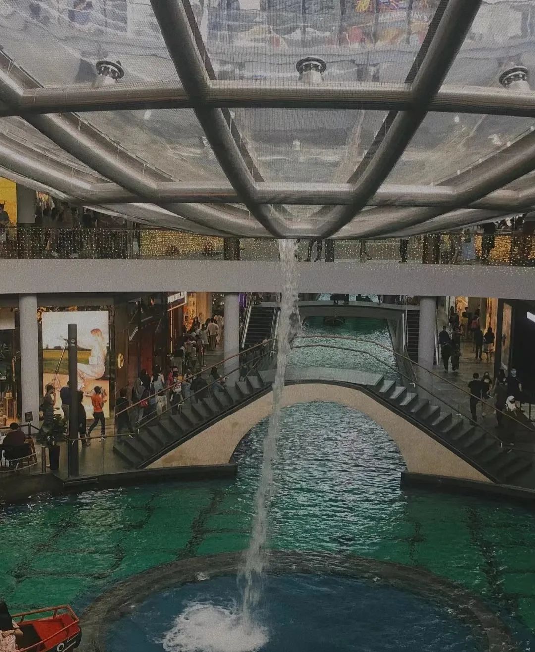 新加坡金沙购物广场,有一处公共空间设计如漏斗盆一样,蓄水装水,在整点的时候打开,水就集中在漏斗口处往下倾泻,这样场景就活了,可见舒服的购物中心和客人之间是没有距离的,它用最简单的原理做出最有趣的创意,东西做得很纯粹,小孩子看了都会喜欢。