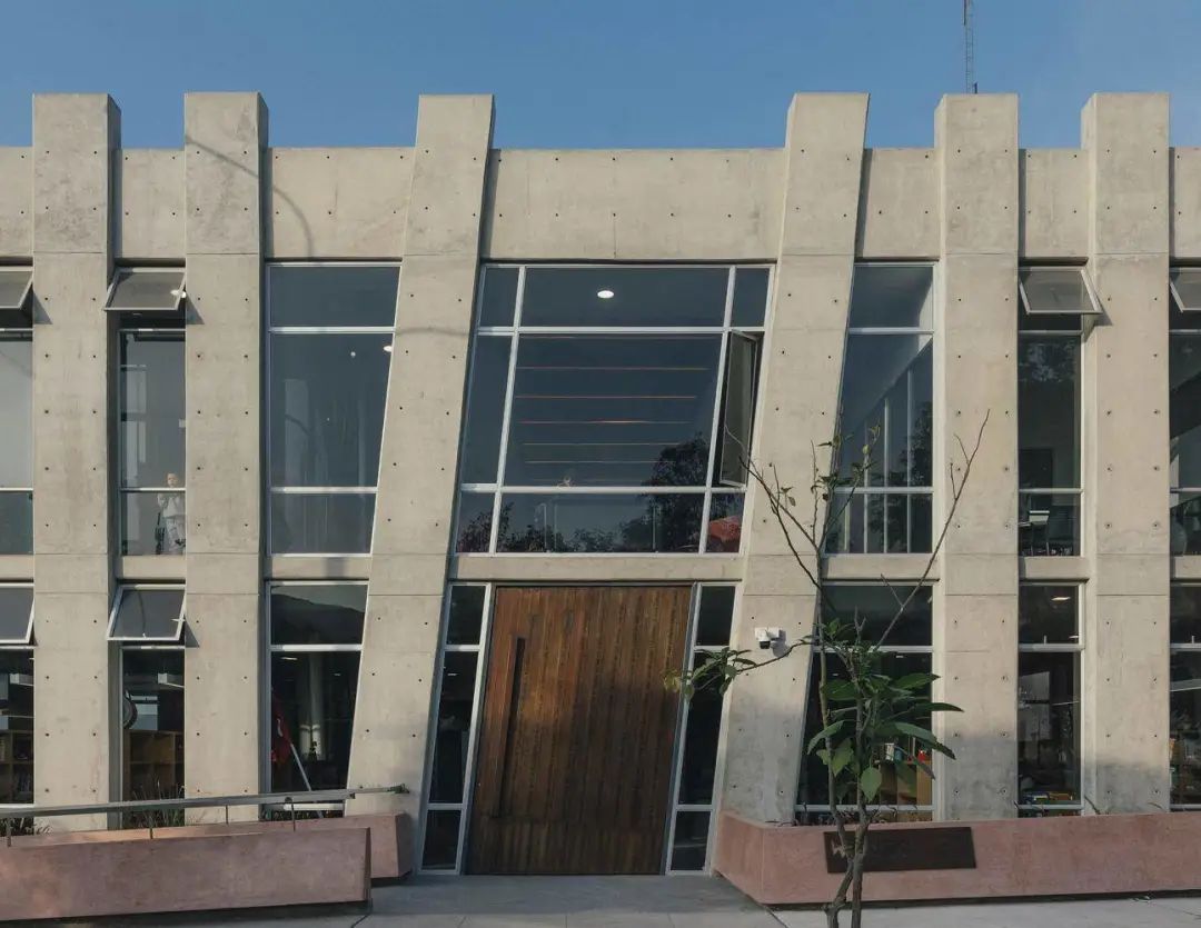 图书馆外观颜色朴素,由灰色水泥墙和木制立面组成,试图营造轻松低调的社区生活氛围。