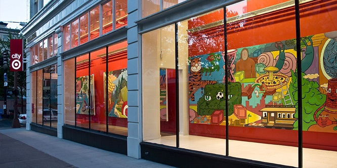 Target 将橱窗开辟成为艺术展览馆,在每个地区寻找大量艺术家为橱窗展示作画,作为扶持他们艺术事业的一种方式,具有公益性质。对于Target 来说,这不仅是一种改善陈旧形象的措施,也为城市增添了临时艺术空间。