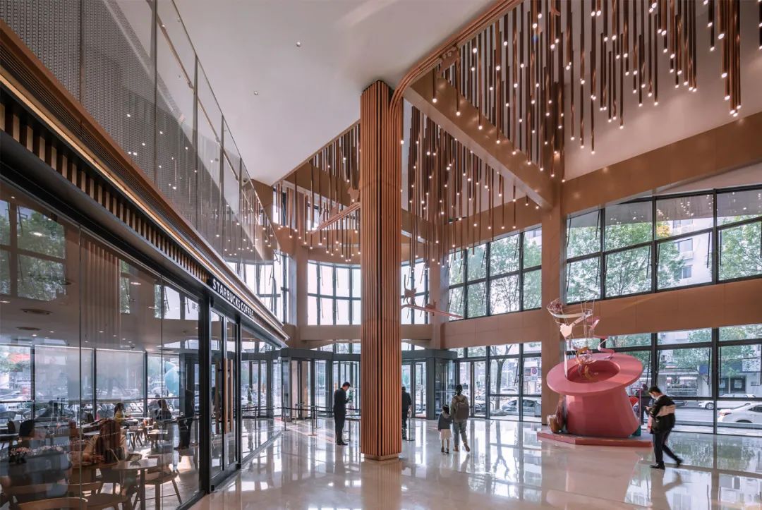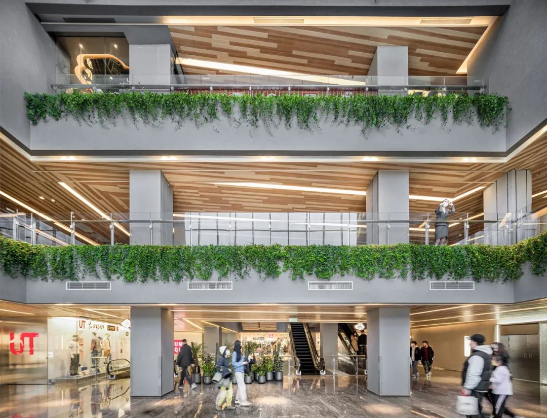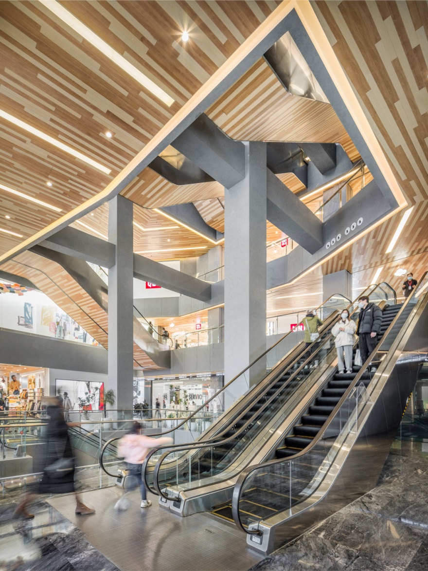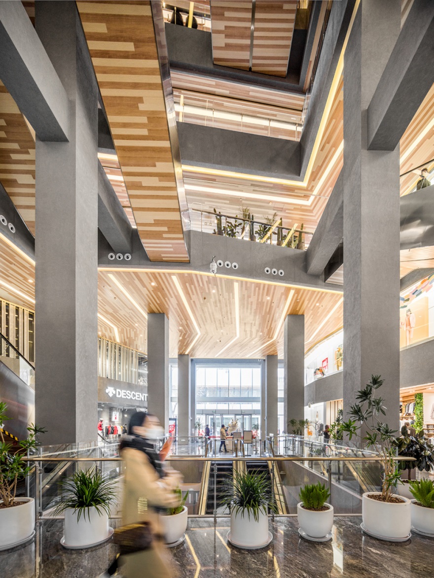 商场室内空间暖色调的木纹铝板、混凝土、 石材等材料打造亲和与惬意的感觉。