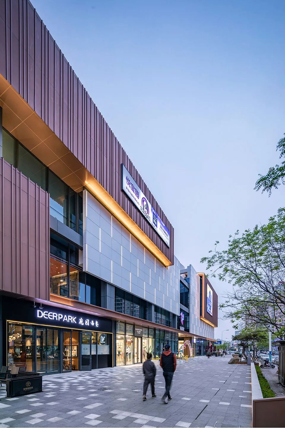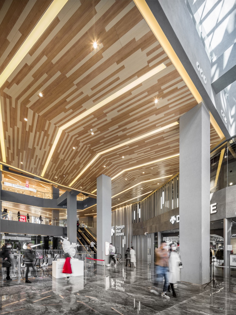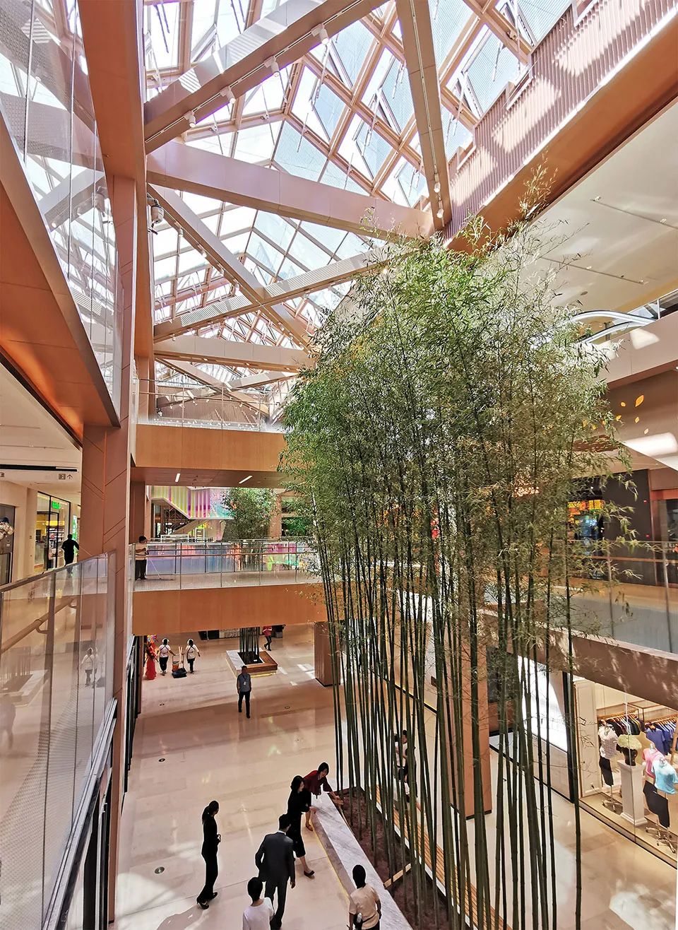 商场室内空间暖色调的木纹铝板、混凝土、 石材等材料打造亲和与惬意的感觉。