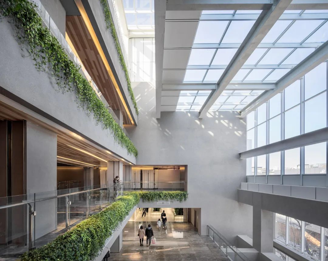 在内部,玻璃中庭连通了地下二层至地上六层的空间,成为了东、南两个方向的人流汇聚点,打破了原建筑内部阻塞的状态,并以自然、明亮的室内体验充分激活了整体商业氛围。