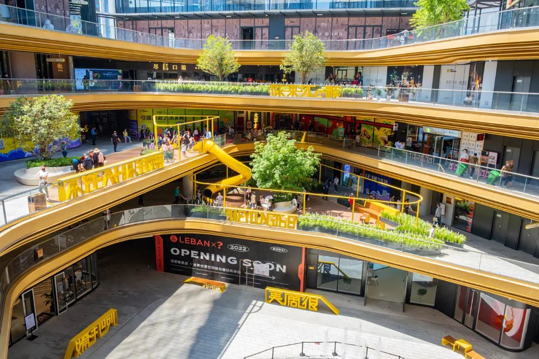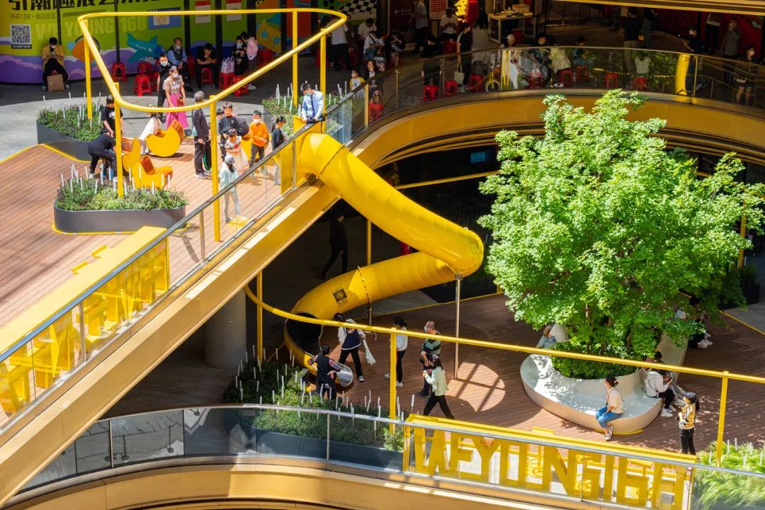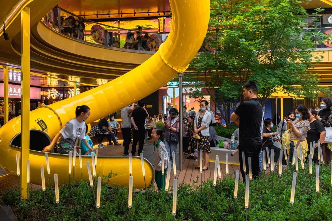 为了将人流引入二层以上,在二三层之间设置了旋转滑梯和旋转座椅,让其成为汇聚人气的打卡点。