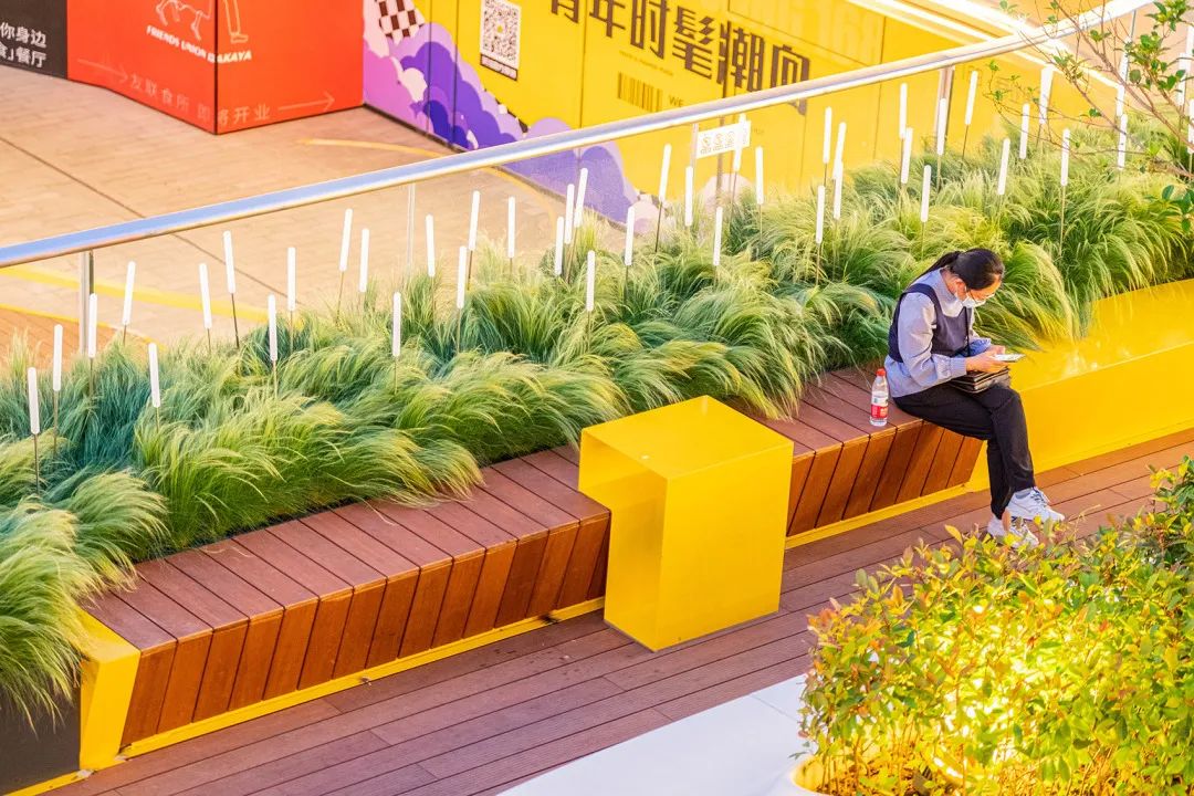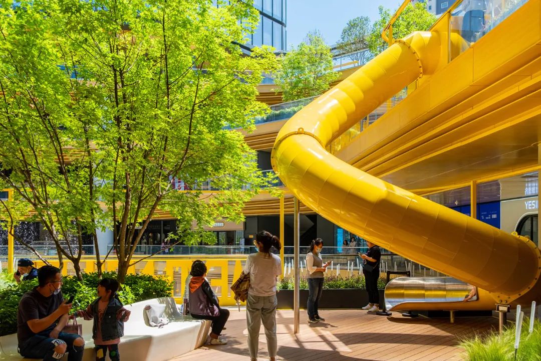 在外观颜色上选择了与建筑完全不同的亮黄色,让景观设施更加出挑亮眼,同时暖色调带给人轻快、温暖、令人愉悦的感觉。