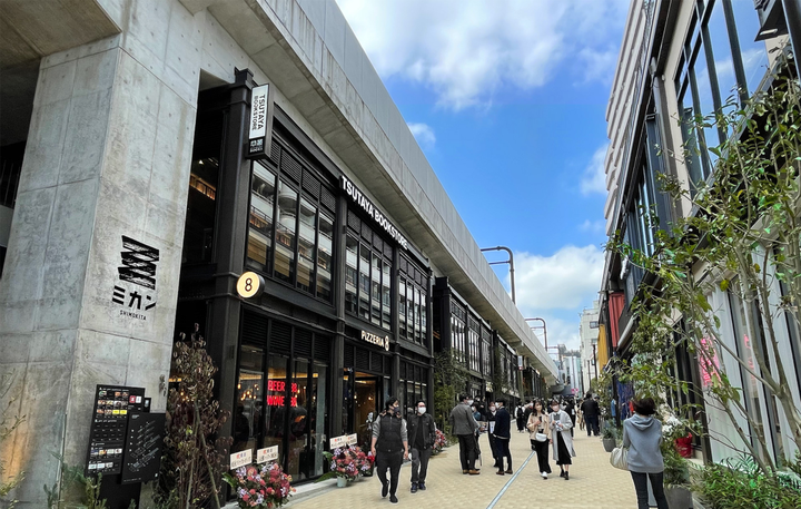 改造后的下北泽车站,一出地铁即能感受到年轻气息。车站二楼共构的地铁上盖小商业,于2020年初开业,引入二次元杂货集合店等生活方式类店铺。而出站之后,延伸的高架桥下也被打造为商业空间利用,于2022年3月开业,由 23 家店铺和共享办公场所组成。引入业态包含大众酒场Bistro、西式餐吧,以及韩国料理、越南料理等特色的异国料理,餐饮占比达80%。除此之外,还引入古着品牌东洋百货店、全日本具有最大漫画卖场的TSUTAYA Bookstore(茑屋书店)。紧邻车站的另一侧是一栋五层的(tefu)lounge,于2022年1月开业。这栋复合商业设施以街区客厅为概念,打造在地客群及外来访客共享的下北泽场域,包含咖啡厅、公共活动场所等职能,其中一层为一间名为「K2」的小型电影院,专门播放小众艺术电影,十分符合下北泽演艺之街的风格。