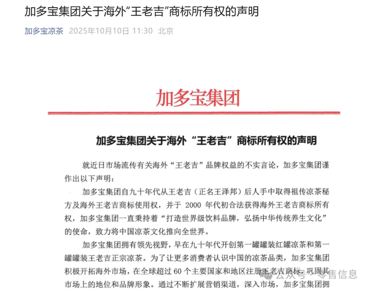 9 月 30 日,加多宝率先打破沉寂,通过公众号高调宣称 “维权告捷”:关联公司万捷有限公司在加拿大联邦法院、欧盟普通法院的诉讼中胜诉,已在全球 63 个国家和地区手握 “王老吉”“WONG LO KAT” 等系列商标的有效注册,覆盖六大洲的商标布局被其称为 “品牌护城河”。这份带着胜诉光环的声明,瞬间点燃了新一轮争端。